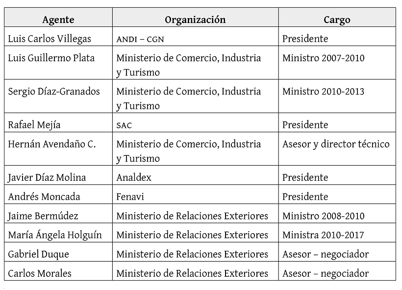 En este juego de intereses y roles, desplegado durante 2011 y 2012, hubo unas figuras clave para llegar a esa decisión final, esto se ve reflejado en la tabla 1 que se expone a continuación. De acuerdo con la información obtenida, tales actores fueron los de mayor actividad, cercanía al presidente y liderazgo para facilitar la firma del AM.