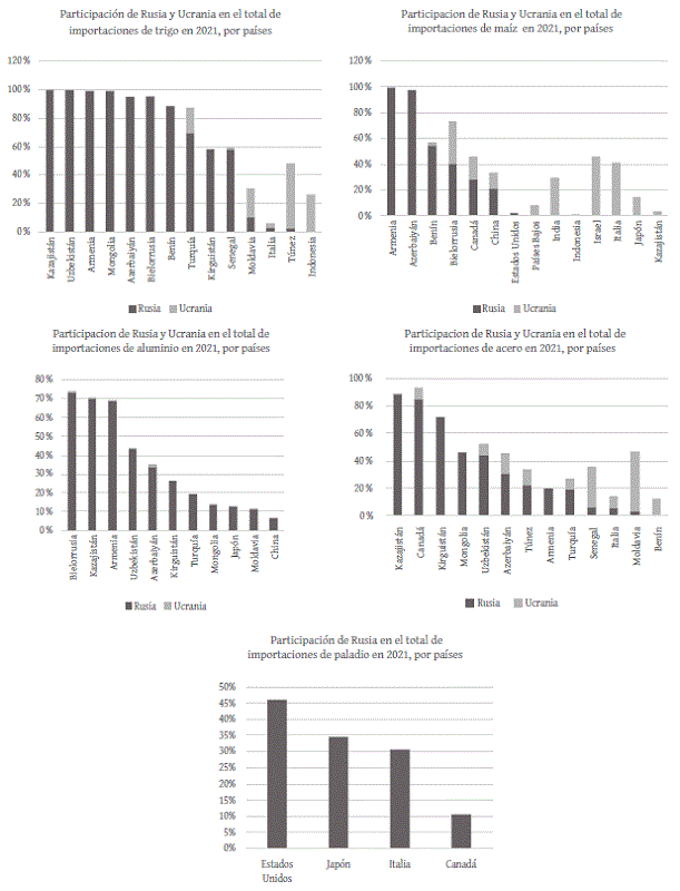 En particular, la integración de estos mercados a las cadenas industriales europeas y a los sistemas alimentarios del Magreb y Asia Central -especialmente, el grado de concentración de comercio de algunos de estos flujos- profundizaron las preocupaciones (figura 1). Por ejemplo, Mongolia y Kazajistán concentraban la totalidad de sus importaciones de trigo en Rusia. Algo semejante pasaba con el comercio de maíz, en el cual Armenia y Azerbaiyán obtenían más del 95 % de sus importaciones de Rusia, en tanto que el 33 % de las importaciones de maíz de China de 2019 se concentraron en Ucrania y Rusia. En materia de acero y aluminio y en el aprovisionamiento de paladio, mercados tanto europeos como asiáticos y americanos tenían elevados niveles de concentración de sus importaciones en los dos países involucrados en el conflicto (OMC, 2022a).