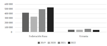 En los flujos de mercancías, las exportaciones de Ucrania fueron las más afectadas, con una caída del 30 % (figura 2). En julio de 2022 se estimaba que existían 20 millones de toneladas de cereales ucranianos que no podían ser exportados por los bloqueos logísticos8 (Consejo del Comercio de Mercancías, 2022). Por su parte, las exportaciones rusas, producto del alza de los precios, se incrementaron en un 15.6 %, con resultado superavitario de su balanza comercial por USD 282 billones (OMC, 2023c). China, India, Turquía, Alemania, Polonia, Japón, República Checa, Grecia, Brasil y Uzbekistán fueron los principales mercados en 2022.9
