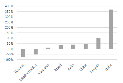 De acuerdo con diversos datos publicados por fuentes oficiales, se estima que China incrementó un 43.4% las importaciones desde Rusia, y un 12.8% sus exportaciones, con un volumen total de comercio de más de USD 190 000 millones (General Administration of Customs People's Republic of China, 2023). En el caso de India, Rusia pasó de ocupar el puesto 25 en el ranking de socios comerciales de 2021 al quinto lugar en 2022 (Ministry of Commerce and Industry, India, 2023). Según los datos estadísticos de las Naciones Unidas,10 Turquía incrementó un 62 % sus exportaciones hacia la Federación Rusa y duplicó sus importaciones, transformándose en su octavo socio comercial tras el estallido del conflicto. El principal producto detrás de estos incrementos fue el trigo, cuya variación se explica por precios antes que por volumen. La figura 3 resume algunos de estos guarismos.