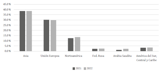 Los efectos directos e indirectos de la guerra, articulados con los de la dinámica de salida de la pandemia, tuvieron impactos regionales diferenciados. La Federación Rusa, paradójicamente, incrementó levemente su participación en el comercio mundial.11 Las economías asiáticas ganaron peso (38.54 %), en tanto que la Unión Europea pasó de ser el 30.21% del comercio mundial al 29.75 %. Entre los exportadores de energía, Arabia Saudita fue uno de los más importantes, al pasar a representar el 1.77% del comercio mundial (vis a vis 1.24 % en 2021) (figura 4). Como resultado, Europa y Asia Central vieron reducido su crecimiento del PBI de un 6.7% en 2021 al 0.2 % en 2022. La Federación Rusa pasó del 4.8 % a -3.5 % (lo que es 5 puntos porcentuales mayor a lo inicialmente estimado por el Banco Mundial). Oriente Medio y el norte de África, en cambio, pasaron del 3.7 % al 5.7 % en 2022. América Latina y el Caribe redujeron sus proyecciones de crecimiento del 6.8 % en 2021 al 3.6 % en 2022.