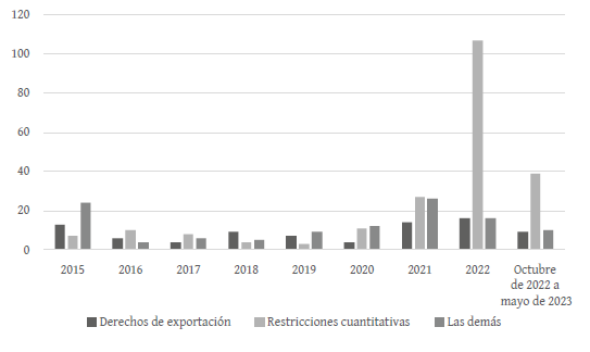 Para marzo de 2022, 29 países notificaron 96 medidas de restricción al comercio agrícola, en el marco de la guerra en Ucrania. Un año más tarde, estas medidas siguen cubriendo un volumen de comercio de USD 85 billones (OMC, 2023b). De hecho, se ha señalado que, por primera vez, "el número de nuevas restricciones a la exportación (129 o el 60.3%) ha superado el de las restricciones a la importación (85 o 39.7%)" (Órgano de Examen de las Políticas Comerciales, 2022, p. 26), según se muestra en la figura 7. En total, el volumen de comercio afectado por medidas restrictivas ascendió al 9.3 % del comercio global (0.4 puntos más que en 2021).