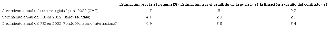 Estas características llevaron a que, desde febrero 2022, el comercio afectado por el conflicto fuera motivo de investigación en diversos centros de estudios y organismos internacionales. Las primeras estimaciones de la OMC marcaban una contracción de las proyecciones de crecimiento del comercio del 2.2%. El Fondo Monetario Internacional (FMI) ajustó en abril sus proyecciones de crecimiento para 2022 de un 4.4 % a un 3.6%; y en junio, nuevamente, las redujo a un 3.2 %. El Banco Mundial, por su parte, en junio 2022 contrajo su proyección de crecimiento global anual en un tercio, pasando de 4.1 % a 2.9 %.