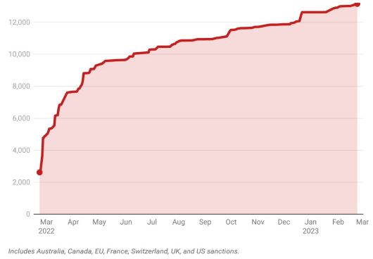 Following the literature, sanctions can be defined as "restrictive policy measures that one or more countries take to limit their relations with a target country in order to persuade that country to change its policies or to address potential violations of international norms and conventions" (Morgan et al., 2023, p. 3).7 Regarding the role of such sanctions in the case of Russia, first, since 2014, over 13,000 sanctions were imposed on Russia, and among them, approximately, 11,500 were imposed after February 22, 2022 (Cameron, 2014; Castellum.ai, 2023, Graphic 1; "EU extends...", 2017). See Figure 1 for a visualization of the sanctions that year. In 2014, 2022, and 2023, the consequences of these sanctions on the Russian economy did not directly impact the approval ratings of the Putin administration; during 2014 and in the past two years (March 2022 and February 2023), Putin's approval ratings remained in the range of 80%-85% (Crimmino, 2018; Statista, 2023). Therefore, despite the clear consequences of the sanctions for the Russian economy-the economy's contraction and inflation, in particular8-these issues were already foreseen to some extent by the Russian government when it decided to start operations on Ukrainian territory: "Russians, unlike the Western world, learned from the sanctions following the annexation of Crimea" (van Bergeijk, 2022, p. 12). All the above statements point to the limitations of imposing sanctions.