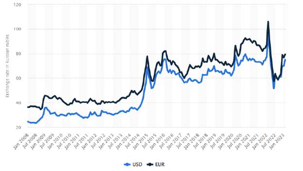 The efforts to strengthen the ruble in relation to the dollar were consolidated after Vladimir Putin's announcement that he would only accept rubles from the "hostile countries" as a means of payment for the purchase of gas ("Putin wants...", 2022; Vior, 2022). Regarding circumvention strategies, this step has several short-term implications for (i) Russian banks that are not prohibited in SWIFT and (ii) the types of formal or informal banks in third-party countries, which could act as intermediaries. India and China seem to be better positioned to fulfill this role. On the whole, it is obvious that despite volatilities of the exchange rate, it is possible to anticipate a new rise and stabilization of the Russian ruble at the same level since 2014 after the first wave of Western sanctions (Figure 2).