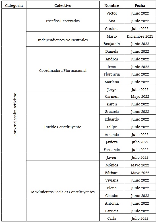 La tabla 1 reporta la lista de entrevistados por categoría y colectivo de pertenencia. Las entrevistas fueron realizadas bajo criterio de confidencialidad, por lo tanto, las referencias a los convencionales son anónimas y las citas incorporadas se identifican a través de un alias. Adicionalmente, la mayoría de las entrevistas utilizadas fueron realizadas entre mayo y agosto de 2022, es decir, mientras la Convención seguía en funciones y/o antes del plebiscito de salida del 4 de septiembre de 2022.