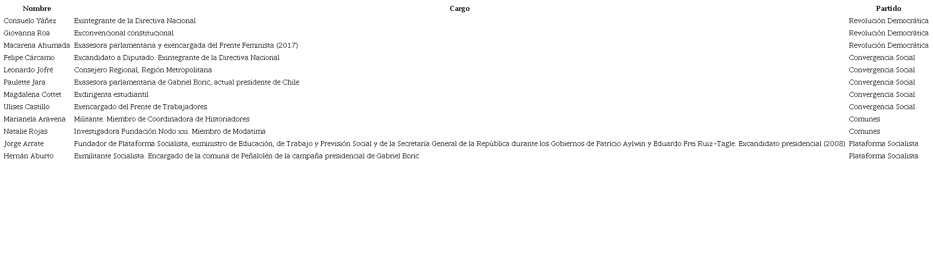Sin embargo, el fa ha experimentado múltiples quiebres con la salida de varias de sus organizaciones fundantes. En paralelo, la coalición también ha experimentado distintos procesos de fusión entre las organizaciones restantes. A inicios de 2024 el fa estaba conformado por tres partidos y una organización política. En primer lugar, el partido más pequeño de la coalición, Comunes, surgió en 2019 a partir de la fusión de Poder Ciudadano e ia. En segundo lugar, Convergencia Social (cs), partido al cual pertenece el actual presidente Gabriel Boric, emergió a partir de la confluencia del Movimiento Autonomista, Izquierda Libertaria, Socialismo y Libertad, y Nueva Democracia. En tercer lugar, rp surge como iniciativa de dirigentes de la Nueva Acción Universitaria, organización estudiantil de la Universidad Católica de Chile, exmilitantes del ps y algunos activistas ligados a espacios de formación de la Fundación Dialoga, vinculada a la expresidenta Michelle Bachelet (Muñoz & Duran, 2021). Finalmente, Plataforma Socialista es una organización política no inscrita como partido y que surge a partir de una serie de quiebres en el ps.