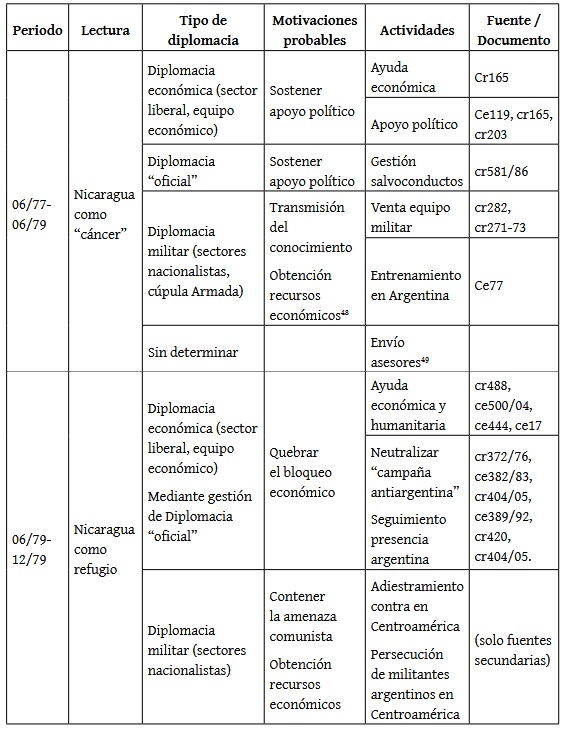 El presente artículo apuntó a poner en contexto las diversas lecturas y actividades extraterritoriales que los militares argentinos desarrollaron en Nicaragua frente a la expansión de la conflictividad social y el sandinismo triunfante (1977-1979). Se tomaron para ello una serie de documentos que, pese a no resultar exhaustivos (corresponden a lo identificado como "diplomacia oficial"), resultan sólidos y abarcan el período completo. Aunque dan cuenta de manera incompleta de las actividades desarrolladas por los otros sectores o canales diplomáticos (razón por la cual se apeló a fuentes secundarias en este tema), sí contienen evaluaciones y lecturas políticas de los militares argentinos en el poder, elemento que se resalta en el presente escrito.