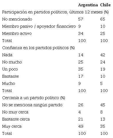 De hecho, los resultados de nuestra encuesta sugieren que los partidos políticos en Argentina tienen vínculos más fuertes con los manifestantes en comparación con sus pares chilenos. La tabla 1 muestra esto, al considerar tres indicadores de vínculos entre ciudadanos y partidos disponibles en la encuesta: participación en partidos políticos durante los últimos 12 meses, según lo informado por el encuestado; confianza en los partidos políticos en general; y cercanía a un partido político específico (en caso de que el encuestado mencionara dicho partido). Estos tres indicadores miden vínculos actitudinales y conductuales con los partidos y, por lo tanto, proporcionan diferentes puntos de entrada empíricos a nuestro tema.