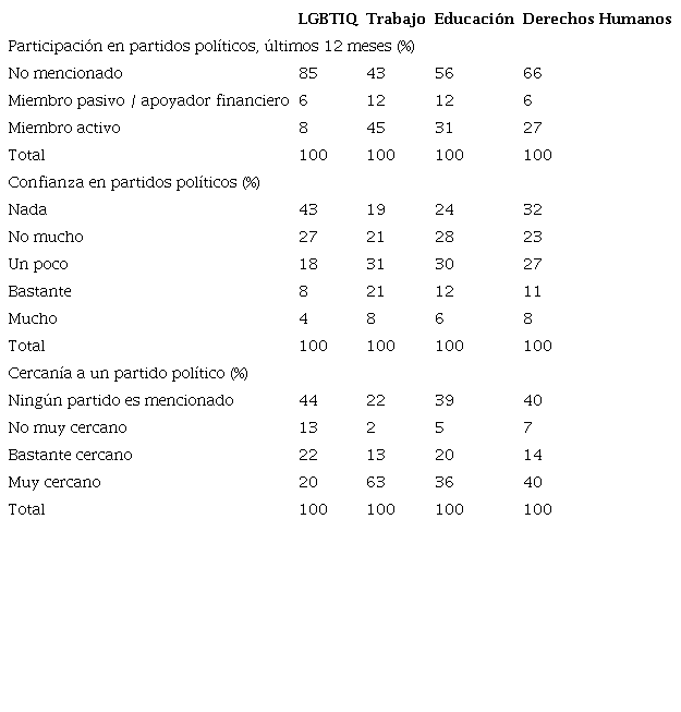 Esto no es sorprendente, históricamente los movimientos laborales han tenido vínculos más fuertes con los partidos políticos, ya que buscan defender los derechos e intereses de los trabajadores dentro del sistema político. Por otro lado, los manifestantes LGBTIQ son los menos conectados con los partidos políticos. Esto podría deberse a que las cuestiones LGBTIQ tradicionalmente han sido ignoradas por la política partidista hasta hace muy poco, ya que los conflictos redistributivos aún estructuran gran parte de la competencia entre partidos. La misma tendencia se replica en relación con la confianza y la identificación con los partidos políticos (tabla 2). En temas de educación y derechos humanos, nuestros datos muestran que se encuentran en el medio del espectro en términos de conexiones con partidos políticos.