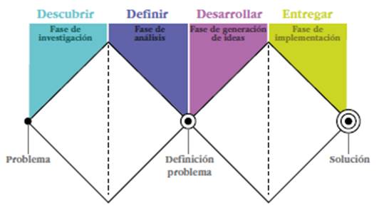 Para encontrar esas soluciones que logren un alto nivel de innovación y cumplir los tres principios fundamentales -factibilidad, deseabilidad y usabilidad-, el proceso de diseño cuenta usualmente con las siguientes etapas: descubrir, definir, desarrollar y entregar ("Framework for Innovation...", 2019), en las cuales está presente el pensamiento divergente y convergente, que permite tener una visión de alternativas de manera global y a la vez detallada (Brown, 2008).