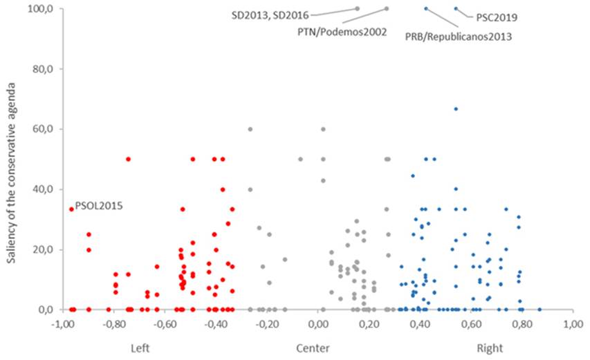 The left-right position is taken from the Brazilian Legislative Survey (Zucco & Power, 2023). The saliency of the conservative agenda is measured for each party in each year as the proportion of conservative changes relative to the total constitutional amendment activity. The conservative changes embodied in each constitutional proposal were manually coded according to two filters: the chapters of the constitution targeted (if they refer or not to typical concerns of conservative agenda) and the direction aimed in the amendment proposal (if reinforcing or loosening the conservative content).17