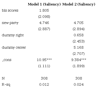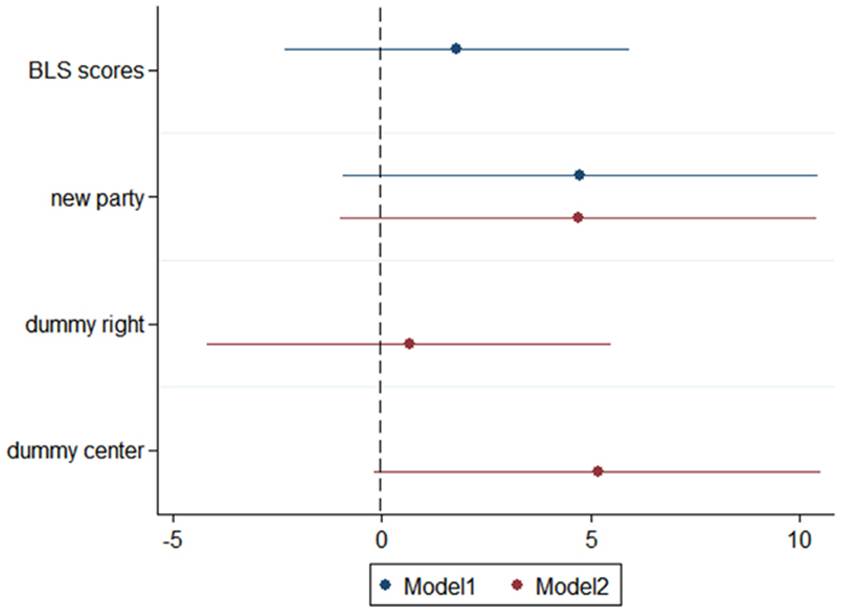 The new parties (those created in the xxi century) are dispersed throughout all the quadrants. Among those five parties with 100% pecs seeking conservative changes, only two (SD and PRB/Republicanos) appeared after 2001. The regression results in Table 6 and Figure 2 confirm that the saliency of the conservative agenda is not related to ideology or new-entrant parties.20