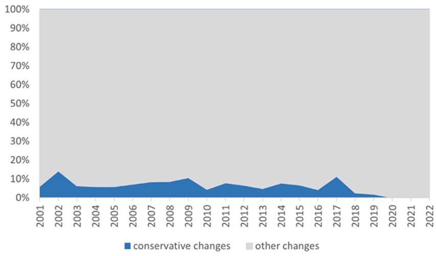 As the data comprise more than 20 years and six legislatures, and Brazilian parties move along the left-right scale over time, the next step is to compute the proportions of conservative changes for each party each year. Thus, the measure accounts for changes in the status quo and party priorities. The average saliency among the 308 unities of party/year is 11,8 %, varying from 0 (as 136 cases of party/year points) to 100 % (as sd in 2013 and 2016, PTN/Podemos in 2002, PRB/Republicanos in 2013 and psc in 2019).