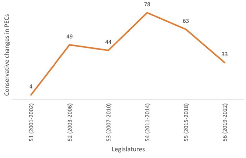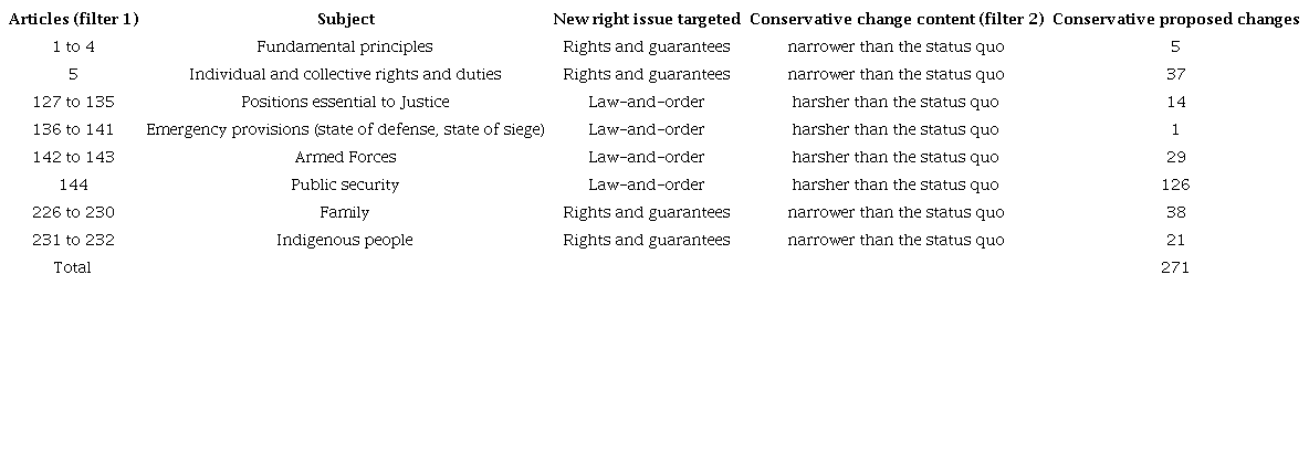 Proposals for constitutional changes targeting these articles, either to narrow the rights or to harden the law-and-order provisions, were coded as a pro-conservative new right agenda. To identify both rights narrowing or law-and-order hardening, each proposed change was compared to the constitutional status quo, that is, the target articles in the Constitution as they were in force at the moment of the pec's introduction. Amendments in articles on rights and guarantees (such as those related to diversity, gender, sexuality, religion, race, and childhood) would narrow them, while amendments in articles on law and order would harden punishment, control, and coercion.14