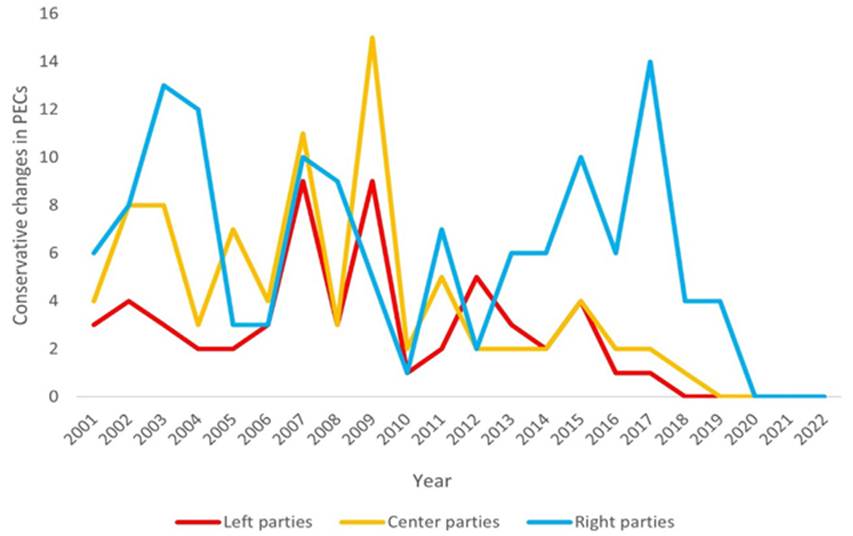 Beyond the variation over time, the frequency of conservative constitu tional changes proposed yearly varies among ideological blocks. Figure 5 shows cycles of pec with conservative content, differentiated by ideology. Deputies from right-wing parties proposed conservative changes at the beginning and the end of the period, while the center and left parties concentrated their activity around 2009. A possible reason for this variation is how each block of parties sees the status quo, which changes dynamically as amendments are approved.