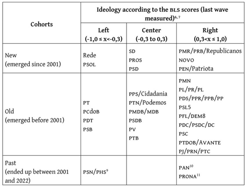 Parties' positions along the left-right dimension, shown in Table 3 are here measured using the Brazilian Legislative Survey - bls (Zucco & Power, 2024) scores.5 There are several other ways to measure party ideology (Tarouco et al., 2022). However, most Brazilian parties converge to the same relative order from left to right, despite the reputation of the inconsistency of the Brazilian party system.
