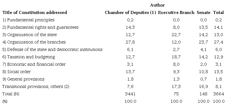 Proposals from the executive branch address significantly more titles on state organization, economic order, and provisional issues than do deputies. Conversely, pecs from deputies address significantly more titles on branch organizations than those from the executive branch. The specific emphases of the executive branch reflect the huge reform agenda of all governments during this period (Couto & Arantes, 2008). Moreover, it is a consequence of the Brazilian policy-oriented model of the Constitution, which, beyond the classic fundamental provisions, norms, and principles, also regulates public policy design, goals, and budgets (Couto & Arantes, 2022). As for the emphases of legislators, it refers to recurrent attempts from deputies to reform political institutions such as the electoral system, length of terms, and re-election.