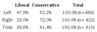 Recent ideological transformations of societies worldwide have posed conceptual challenges to social sciences analysts. Political phenomena such as radical right, far right, conservatism, and populism, despite usually being empirically associated, must be kept theoretically distinct (Kaltwasser, 2023; Mudde, 2022; Rennó, 2023). The theoretical distinction between right-wing politics and conservatism is crucial for this paper's discussion. It is evident, for instance, in the classification of political parties from all over the world made by the Global Party Survey project (Norris, 2020).3Table 2 shows how these two dimensions are not the same despite being associated. Conservative parties are also the majority among the left parties.