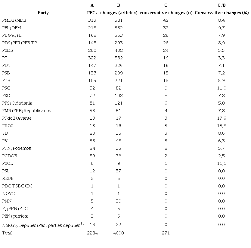 The center party MDB proposed conservative changes more frequently than other parties. However, PSL, DC, and Novo (right-wing parties) did not propose any of these changes. Another piece of evidence against theoretical expectations is the saliency of the conservative agenda (column C) in the whole set of changes proposed (column B). Among the only nine articles addressed by PSOL, a far-left party that originated from a schism in pt in 2005, there was a proposal to include in the Constitution the statement that "all the power comes from God".16