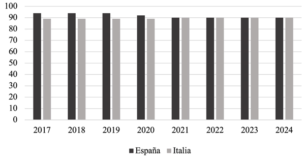 La selección de los casos se debe a que permiten ilustrar una direccionalidad diferente a la usualmente planteada por la literatura, en cuanto a la relación entre los PPA y la democracia. En el presente artículo se considera que la pluralidad política -propia de una democracia- puede generar las condiciones (cuando, a partir del nivel de fragmentación existente, se incentiva la conformación de coaliciones) para la erosión del carácter antisistema de estos partidos. En este sentido, Podemos y el m5S presentan una secuencia de eventos completa, desde su fundación como PPA, pasando por los momentos de negociación, hasta el acuerdo coalicional, primero con fuerzas fuera del establishment y luego incluyéndolas. Mediante la conformación de estas coaliciones los PPA estudiados accedieron al poder. Ahora bien, siguiendo datos de Freedom House, se puede decir que este evento no habría afectado de manera decisiva el nivel de democracia en España e Italia, el cual se mantuvo estable, incluso luego de la salida del gobierno de los mismos (figura 1). En cambio, como se verá al final del artículo, esas coaliciones sí condujeron a la erosión de la razón de ser antisistema de dichos partidos.