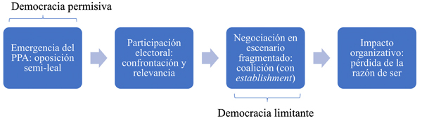 De esta manera, la democracia mediante la pluralidad política existente a nivel competitivo y/o representativo le presenta escenarios diferentes a los PPA: el primero es el de la oposición antagónica frente al establishment (lógica confrontativa); el segundo implica un nivel intermedio, presentándose un cambio de estrategia hacia la negociación y el acuerdo coalicional, pero con fuerzas no del establishment político; el tercero es en el que la estrategia previa sí incluye al establishment. Sostenemos que las dos primeras son compatibles con el discurso polarizador de los ppa, persistiendo una oposición semileal con la élite política. El tercero, en cambio, ya es incompatible con dicha postura, pues involucra un acuerdo con fuerzas políticas del establishment. El adoptar un comportamiento coalicional con el establishment (o parte de este) en lugar del confrontativo, lleva por derivación al abandono de la oposición semileal (Barr, 2009), pues ya se deja de hablar de un ellos como un todo. En cierto modo, la negociación y búsqueda de acuerdo puede entenderse como el reconocimiento del otro, ahora como un par legítimo. La consecuencia de este cambio de estrategia es la siguiente: el PPA pierde su razón de ser en cuanto antisistema.