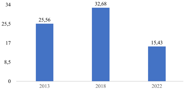 Electoralmente el m5S tuvo un retroceso en comparación a lo sucedido cuatro años atrás (figura 4). Con ello no solo perdió el lugar de primera fuerza electoral que tuvo en 2013 y 2018, sino que pasó a transformarse, nuevamente, en partido de la oposición, luego de la victoria de Fratelli d'Italia (Hermanos de Italia).