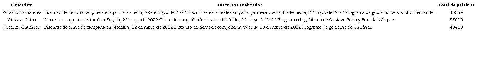 Siguiendo nuestro marco teórico hemos desarrollado un análisis de contenido cuantitativo y cualitativo de los discursos electorales principales de los candidatos presidenciales para determinar sus ideologías políticas. En la tabla 1 se presenta un resumen de los documentos que hemos analizado: