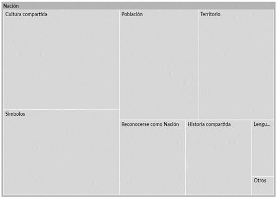 Se indagó, inicialmente, acerca de la forma como se entiende la nación. Como se puede ver en la figura 10, los participantes afirmaron que esta es un conjunto de elementos relacionados entre sí, como la cultura compartida (28 menciones), los símbolos (23), la población (20), el territorio (19), una historia compartida (11), el autorreconocimiento como nación (11) y el lenguaje (5), entre otros elementos de menor relevancia.