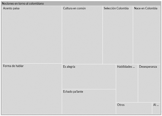 En relación con la forma en que los participantes entendían al colombiano, como se evidencia en la figura 11, se encontraron elementos característicos como el acento paisa, la forma de hablar, la cultura en común, la selección Colombia, el nacer en Colombia, la alegría, ser echado pa'lante, las habilidades sociales y la desesperanza, entre otros elementos de menor relevancia.