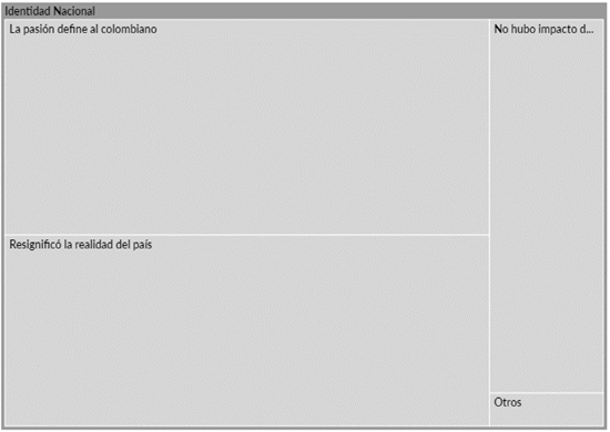 Finalmente, con relación al último eje de indagación, el de fundamento, es acá donde se identifica el discurso de identidad nacional. Van Dijk (2005) sostiene que las ideologías no son cualquier sistema de creencias, sino que corresponden a valores de mayor fundamento para el individuo, y que desde dicho sistema se sostiene otras creencias socialmente compartidas. Como se evidenció en los análisis discursivos de los participantes, existe una relación de la campaña Colombia es Pasión con el discurso de la pasión, el cual encontró diversas mas de expresión. Uno de los elementos que destacaron los participantes fue el relacionado con el fútbol y la manera en que la selección Colombia representaba un foco de identidad nacional. Al respecto, Dávila y Londoño (2003) afirman que existe una posible orfandad nacional de símbolos, lo que ha llevado a la identificación colectiva a través de prácticas culturales, como el fútbol.