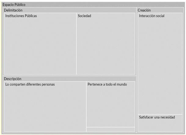 Al indagar respecto a la forma en que se entiende el espacio público, como se evidencia en la figura 3, los participantes lo describen de dos maneras: en primer lugar, como aquel espacio que comparten las personas; y, en segundo lugar, como un escenario que pertenece a todo el mundo. Los participantes también afirmaron que el espacio público se crea a partir de la interacción social y con el fin de satisfacer una necesidad; y se delimita, por un lado, por las instituciones públicas y, por otro lado, por la misma sociedad.