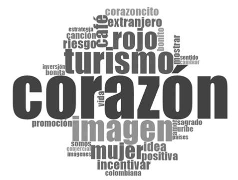 Respecto a la proyección de la campaña Colombia es Pasión en el espacio público, en la figura 9 se puede ver que las principales menciones de los participantes van desde características iconográficas (corazón, rojo, imagen), hasta aspectos emocionales (amor, bonita, positiva). El corazón es la principal asociación que se hace de la campaña, relacionándola con un tema de imagen y turismo.