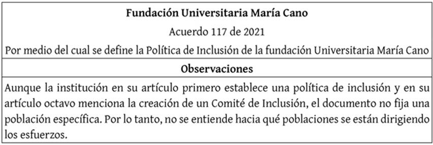 De la tabla 9 a la 12 muestran que, entre las demás IES, la única que cuenta con un acuerdo de inclusión dirigido a unos beneficiarios específicos es la UNINAVARRA, que contempla a grupos étnicos, personas con discapacidad, población víctima y población con vulnerabilidad social. Esta institución, por medio del Acuerdo 006 de 2020, adopta la Política Institucional de Inclusión "Todos a Estudiar". Este documento enumera unos objetivos destinados a la educación inclusiva, pero no es muy claro acerca del presupuesto ni cómo se va a llevar a cabo el proceso de las asistencias económicas y alimentarias. Las demás IES se quedan cortas en la definición de la población que buscan beneficiar con sus políticas de inclusión y no muestran una línea de acción clara.
