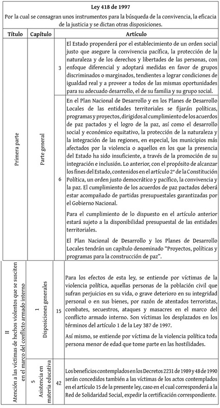 La tabla 4 muestra los acápites de la Ley 418 de 1997 relacionados con reparación e inclusión de víctimas y excombatientes. Expone las disposiciones del Estado para reestablecer el orden y la paz, adoptando medidas a favor de los grupos discriminados y delega responsabilidades a las entidades territoriales.