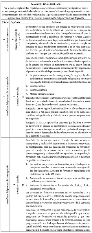 En el 2011 aparece la Resolución 163 de la ACR (tabla 5) y se sanciona la Ley 1448 de 2011 (tabla 6). La primera tiene por objeto reglamentar los requisitos, características, condiciones y obligaciones para acceder a los beneficios de los programas de reintegración a la sociedad civil. El título 2, capítulo 1, incluye la gestión en educación dentro de los beneficios sociales contemplados. La normativa hace hincapié en la educación primaria, básica y media. Sin embargo, en el parágrafo 2 del artículo 8, afirma que la ACR apoyará a la persona reinsertada que esté interesada en adelantar pre-Icfes o educación superior en un nivel profesional, aclarando que esto no necesariamente va a generar un desembolso.