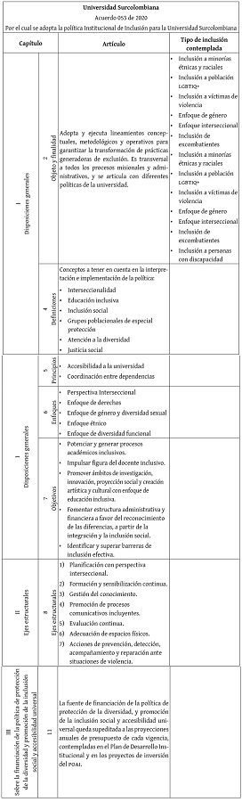 Acuerdo 053 de 2020 [Universidad Surcolombiana]. Por el cual se adopta la política Institucional de Inclusión para la Universidad Surcolombiana. 10 de diciembre de 2020. https://www.usco.edu.co/archivosUsuarios/20/publicacion/consejo_superior/acuerdo/acuerdo_053_de_2020.pdf