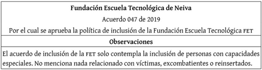 Acuerdo 047 de 2019 [Fundación Escuela Tecnológica de Neiva Jesús Oviedo Pérez]. Por el cual se aprueba la política de inclusión de la Fundación Escuela Tecnológica de Neiva Jesús Oviedo Pérez. Acta 108 del 18 de octubre de 2019. https://www.fet.edu.co/wp-content/uploads/2018/09/ACUERDO-047-DE-2019-INCLUSION.pdf