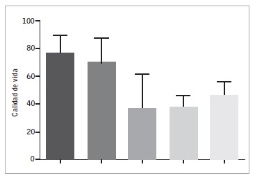 Al evaluar la calidad de vida en todos los pacientes se encontró que la dimensión menos afectada fue síntomas y problemas con 72.6 y la de mayor afectación fue carga de la enfermedad con 36.5 (figura 1).