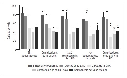Al comparar la calidad de vida entre aquellos pacientes sin complicaciones, los pacientes con complicaciones por la ERC, los que presentaron de 1 a 2 complicaciones por HD, los de >3 complicaciones por HD y los de ambas complicaciones, se encontró que para la dimensión de síntomas y problemas los grupos de 1 a 2 complicaciones por HD, > 3 complicaciones por HD, y los que tienen ambas complicaciones tienen menor calidad de vida que los que no han presentado ningún tipo de complicación.