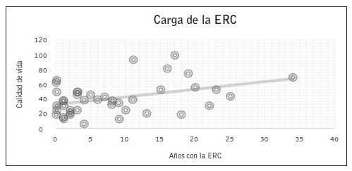 En el presente estudio se encontró una asociación positiva entre la CV en su dimensión carga de la enfermedad renal y años con la ERC. Esto puede deberse a que con el paso del tiempo el paciente acepta más su enfermedad o aprende a vivir con ella.