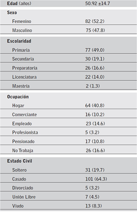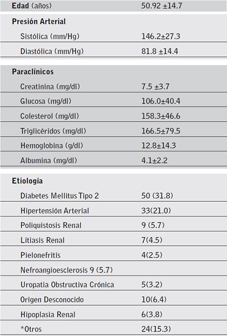 El promedio de edad de los 157 participantes fue de 50.9 años, la frecuencia de hombres y mujeres evaluados fue similar. La mitad de los pacientes tienen como nivel máximo de estudios la primaria. Los principales factores etiológicos de la ERC fueron diabetes mellitus tipo 2 e hipertensión arterial.
