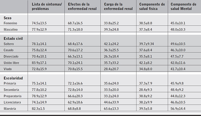 Material and Method: Analytical cross-sectional study in 157 patients in HD (75 men, 82 women), aged 18 years and over 3 months treatment. QoL was assessed with the KDQOL-36 instrument, which, measuring 5 dimensions on a scale of 0 to 100. Was conducted of the bivariate analysis, ANOVA and and multiple regression to assess the ratio v Each Dimensions with Age, sex, occupancy, marital status, education, access type venous access time with the ERC, with HD and complications of CKD and HD.