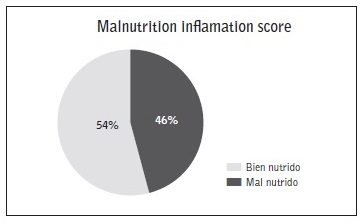 El estado de inflamación-malnutrición se evaluó mediante el test MIS10 (Score Malnutrición Inflamación) con una puntuación de 0-3011, además si era = ó <10. El grado de desnutrición se evaluó mediante el instrumento VGS12.