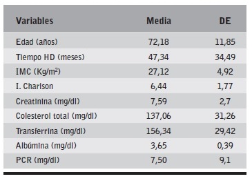 Nuestra muestra de estudio tiene una edad media (72 años), que se corresponde a la media nacional de pacientes en HD14, tienen un tiempo en HD de casi 4 años, alta comorbilidad y sobrepeso.
