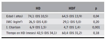 Respecto a la comparación de pacientes según la técnica de diálisis realizada resultó estadísticamente significativa la Edad (74,1 años en HD y 64,5 años en diálisis HDF, p= 0,04) y también el I.Charlson (6,9 vs 4,7 p= 0,001), no hubo relación estadísticamente significativa con el IMC, ni el tiempo en hemodiálisis.
