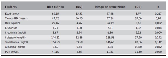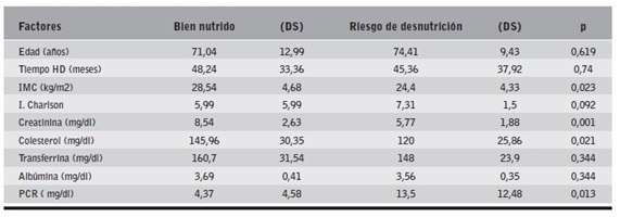 Respecto a la relación del estado nutricional de los pacientes, medido por la VGS, con los otros factores analizados en el el estudio, resultaron significativos el IMC (28,54 en bien nutridos y el 24,4 en los que tenían riesgo de desnutrición; p=0,023), creatinina (8,54 vs. 5,77; p=0,001), colesterol (145,96 vs. 120,00; p=0,021) y PCR (4,37 vs. 13,5; p=0,013). No hubo relación significativa con la edad, tiempo en hemodiálisis, índice de Charlson, transferrina ni albúmina. (Tabla 3).