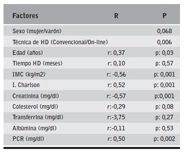 The Score Malnutrition Inflammation (MIS) was related to BMI (p: 0.002), Charlson's index (p: 0.01), creatinine (p: 0.009) and CRP (p: 0.02); not with age, time on hemodialysis, total cholesterol, transferrin and albumin (p> 0.05).
