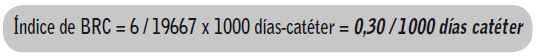 En el periodo de estudio se registraron 6 BRC, de acuerdo a los criterios de infección establecidos previamente; fueron 19.667 el número total de días-catéter de todos lospacientes incluídos, con lo que el índice de BRC fue el siguiente: