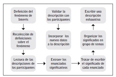 Para la interpretación metodológica del estudio se seleccionó el abordaje de Colaizzi, quien refiere que para ampliar el conocimiento de un fenómeno, primero deben conocerse las fundamentaciones del mismo, estableciendo la definición del fenómeno de interés con base en la recolección de descripciones de los participantes, seguido del análisis secuencial para depurar la esencia de la información y validación, con los mismos participantes para llegar a elaborar una descripción exhaustiva del fenómeno a estudiar13. (Figura 1)